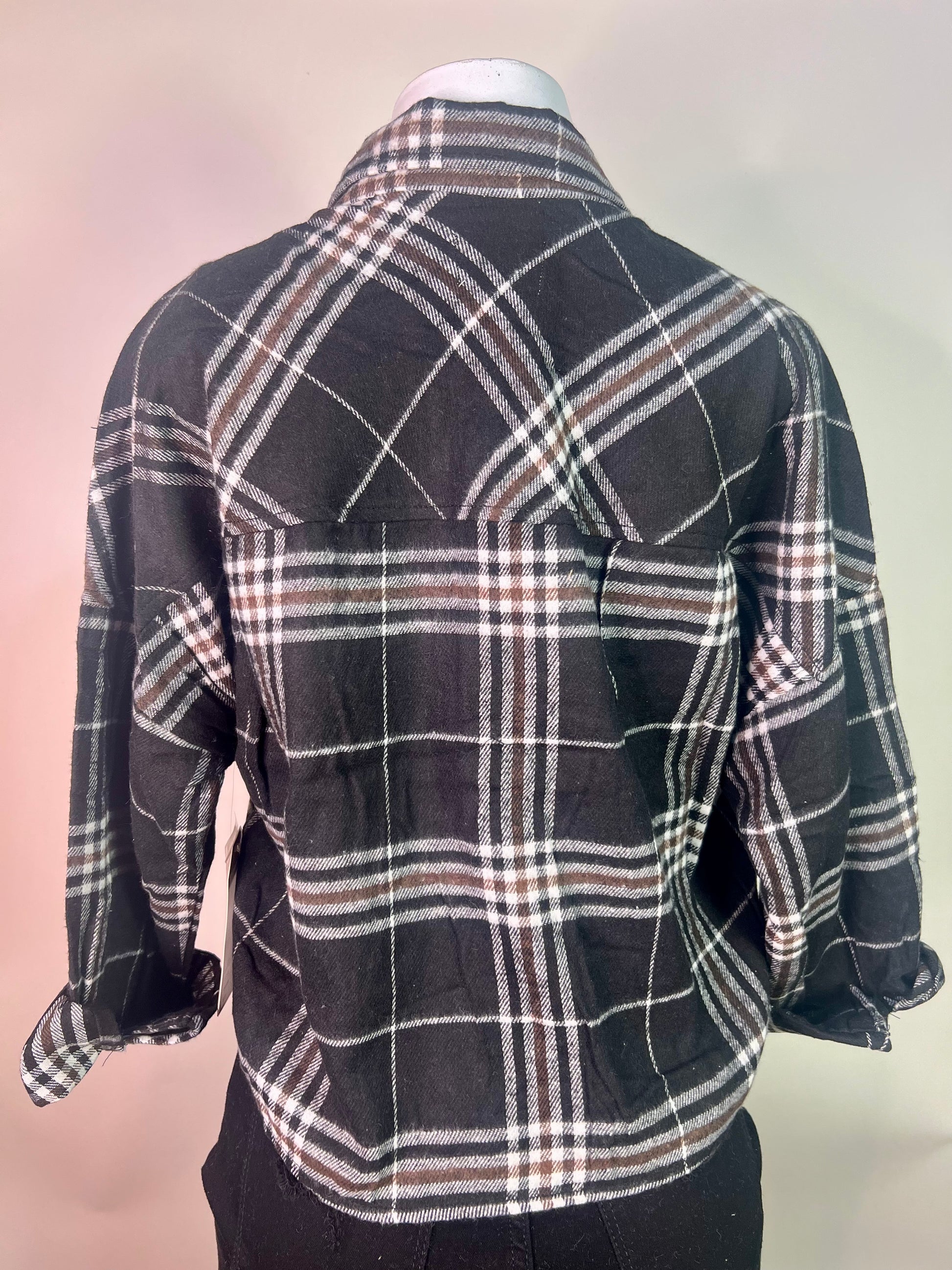 Crop black and brown flannel, with buttons. Runs slightly oversized.