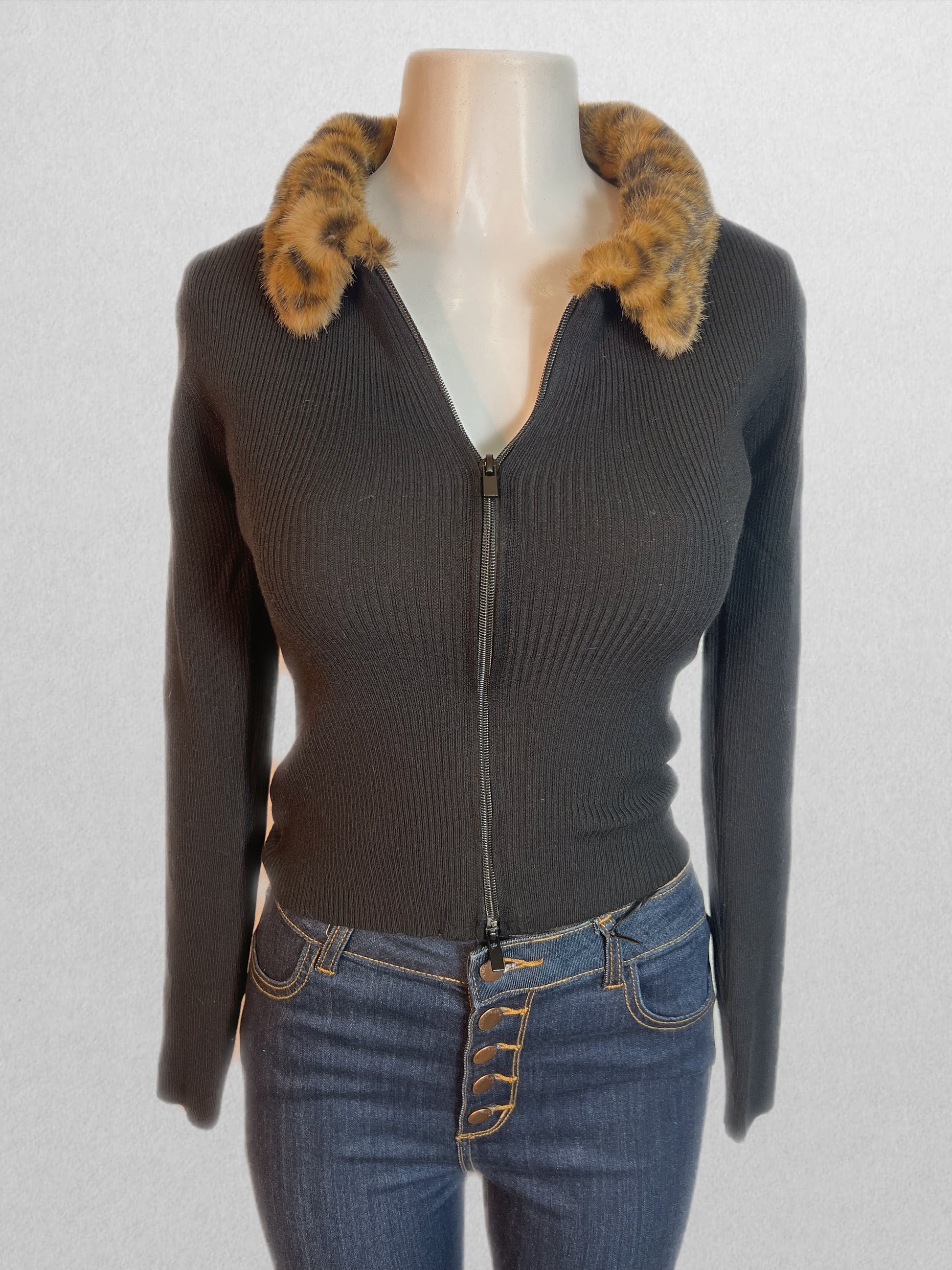 Black cardigan with cheetah fur collar. Double zipper, good stretch.