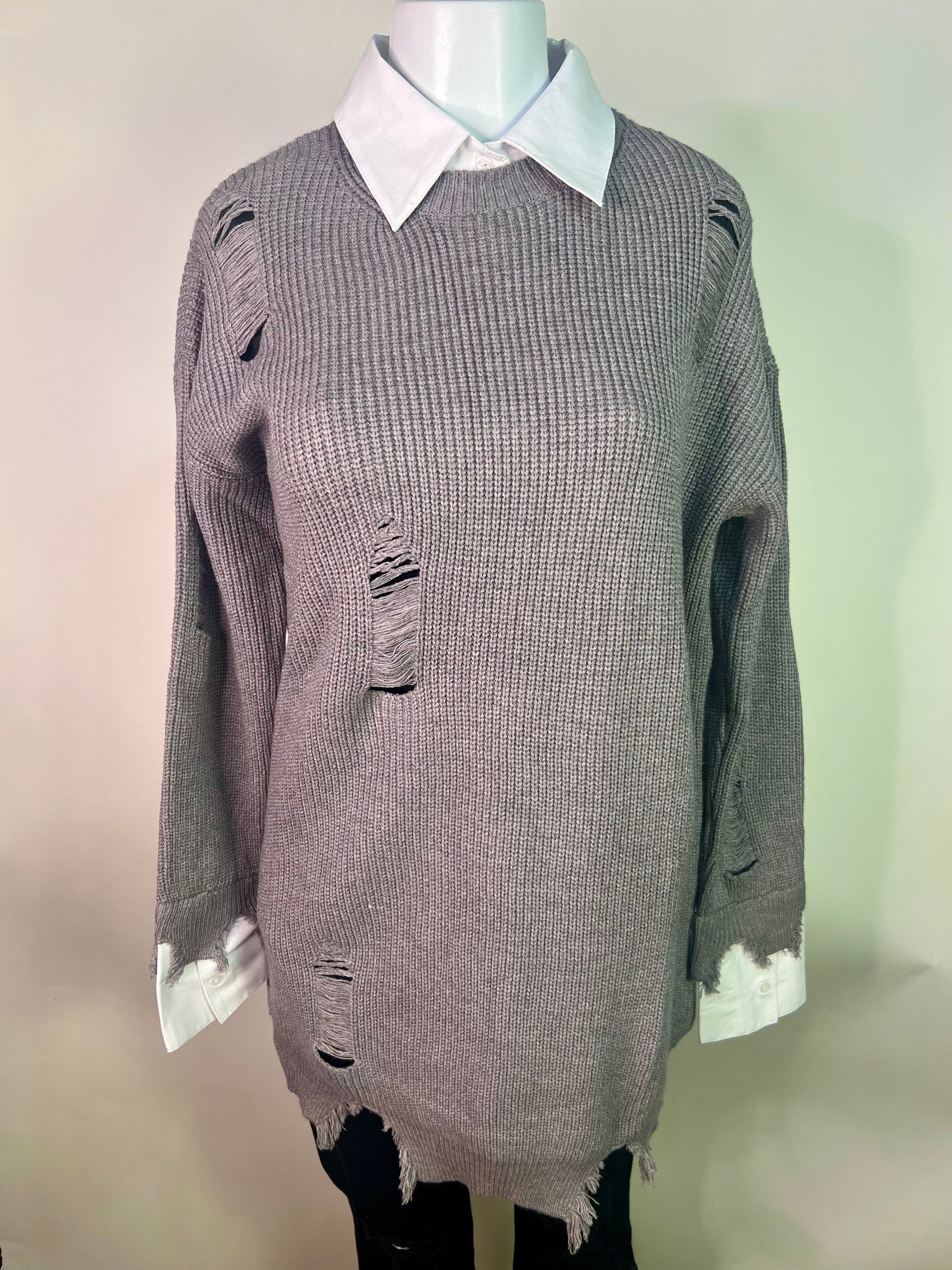 Gray sweater dress with white sleeves. Runs slightly oversized