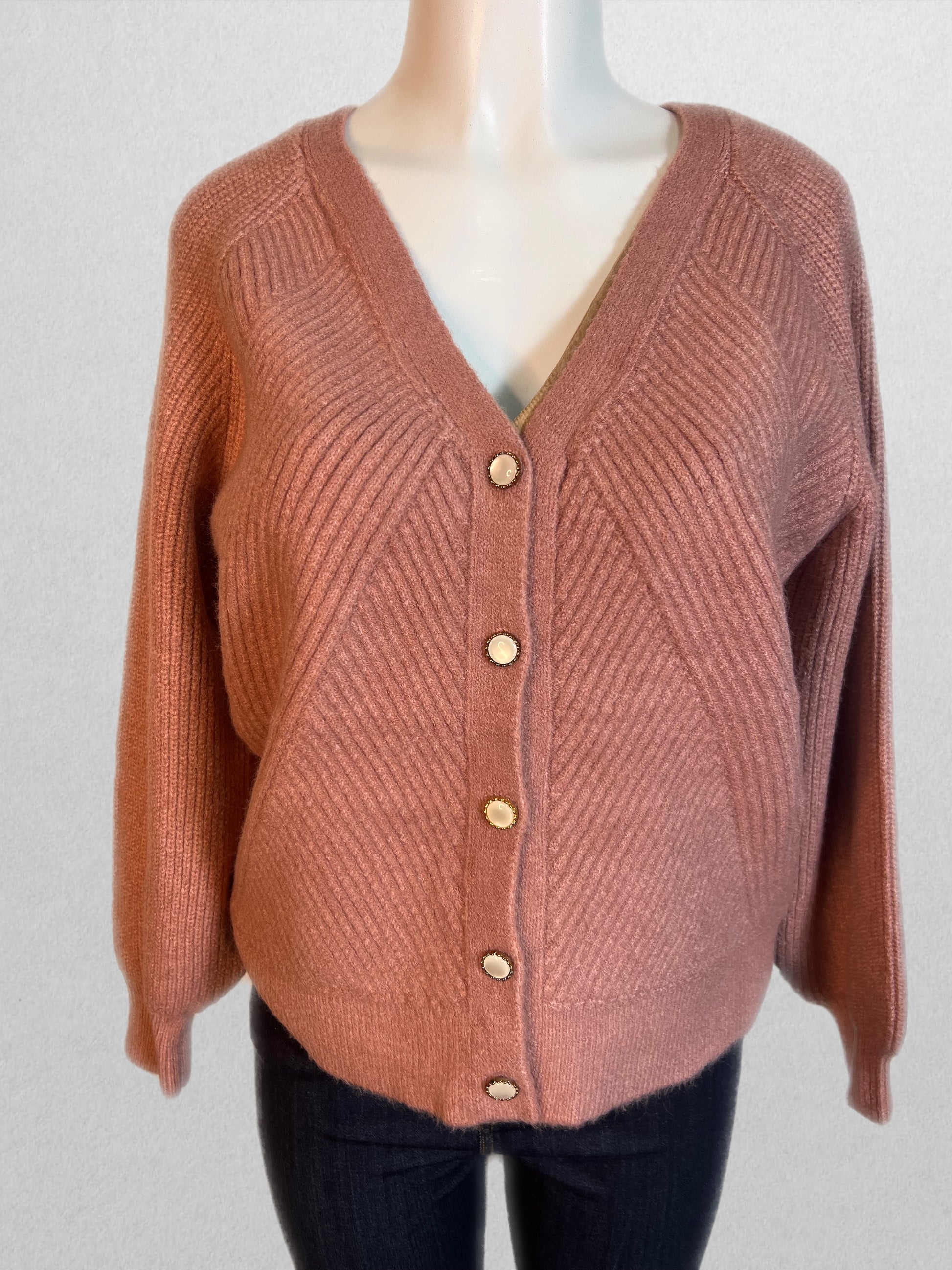 Pink oversized cardigan with beige and gold buttons. Has great stretch and can be slightly oversized.